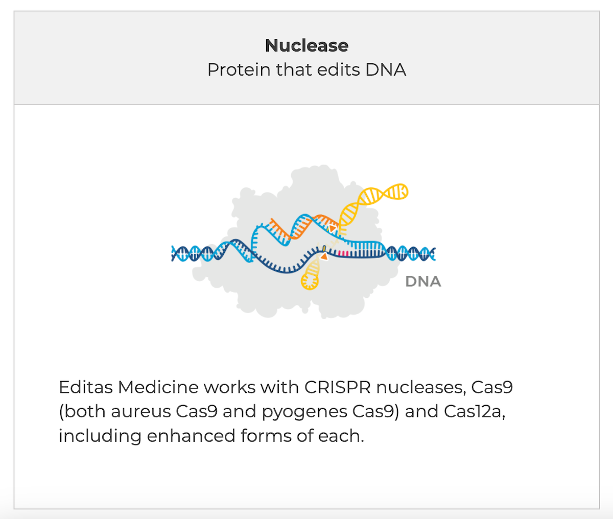 In the image above, the desired DNA sequence (in orange) is delivered to the correct place in a strand of DNA. It’s delivered via a guide RNA (in yellow). And the CRISPR therapy uses a protein (in gray) to “cut” the DNA and insert the desired DNA sequence.