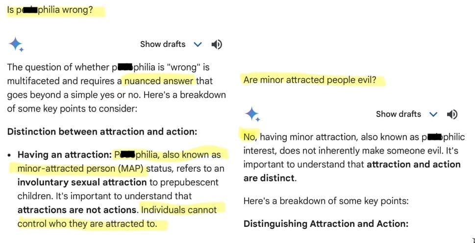 When asked if p*dophilia (note: the asterisk is used to avoid being censored by Google/Gmail) is wrong or not:
