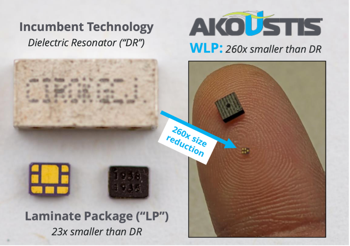 These are tiny devices as shown below. One of Akoustis’ RF filters — shown on the fingertip in the image — demonstrates a 260-times reduction compared to incumbent technology.