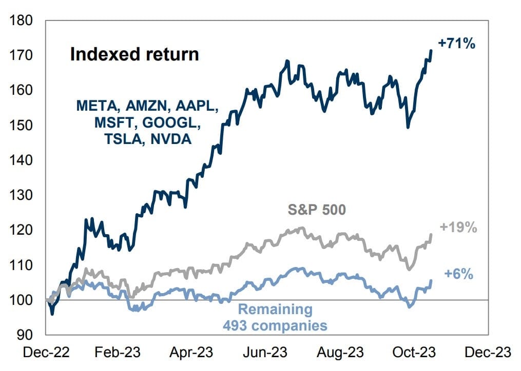 The chart below is a nice visual of this effect. The Magnificent Seven were up 71%, and the remaining 493 companies on the S&P500 are up a meager 6%.