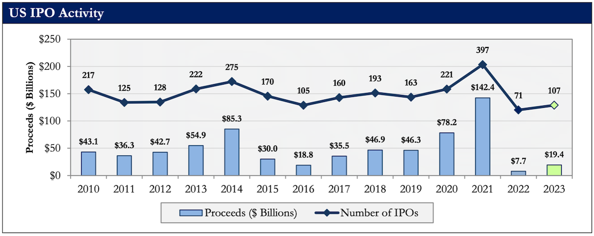 Yes, it was in improvement over 2022, which was a complete disaster, but still, this year was one of the worst on record. Only $19.4 billion was raised across 107 IPOs, most of which were completely uninteresting.